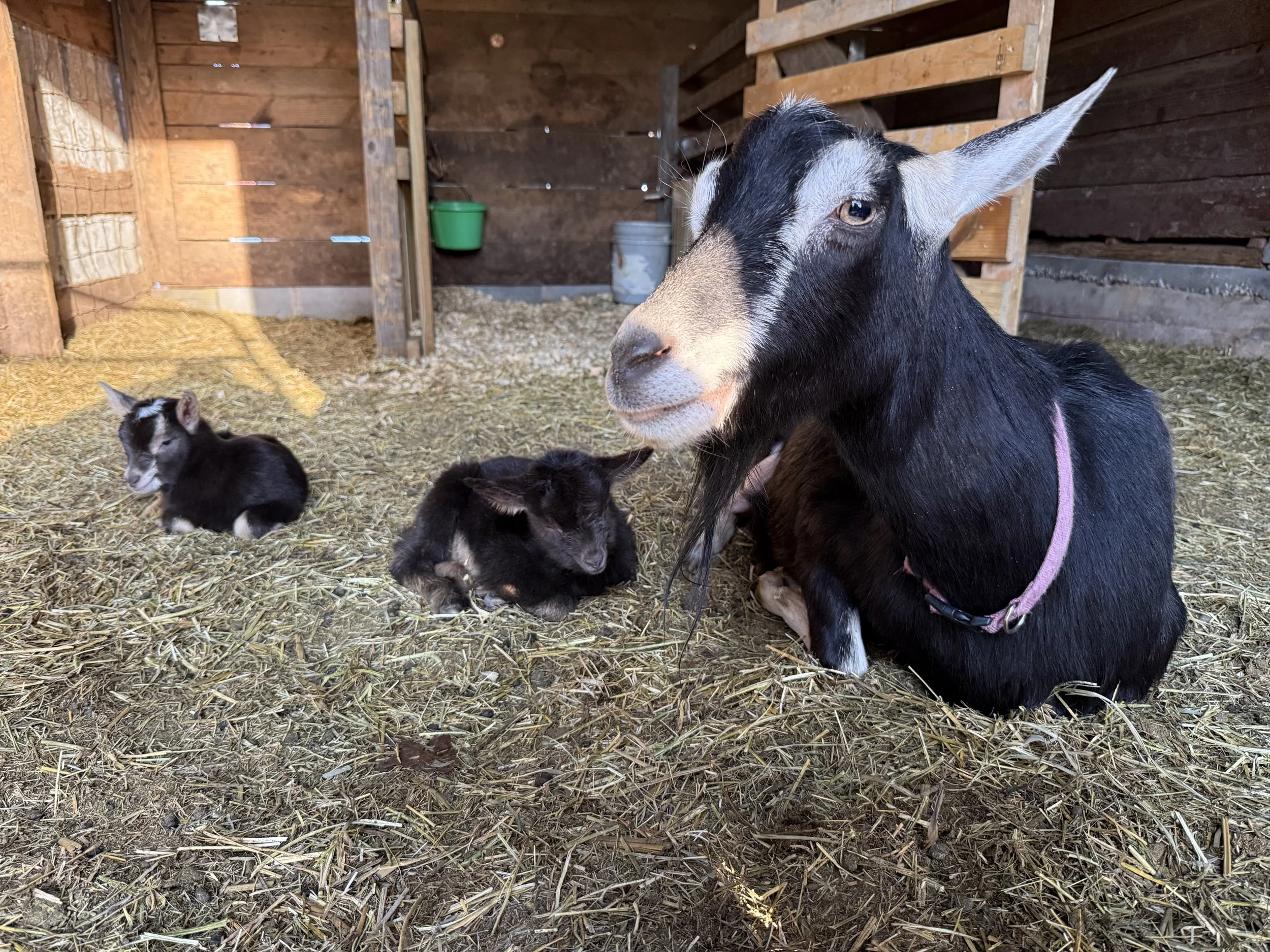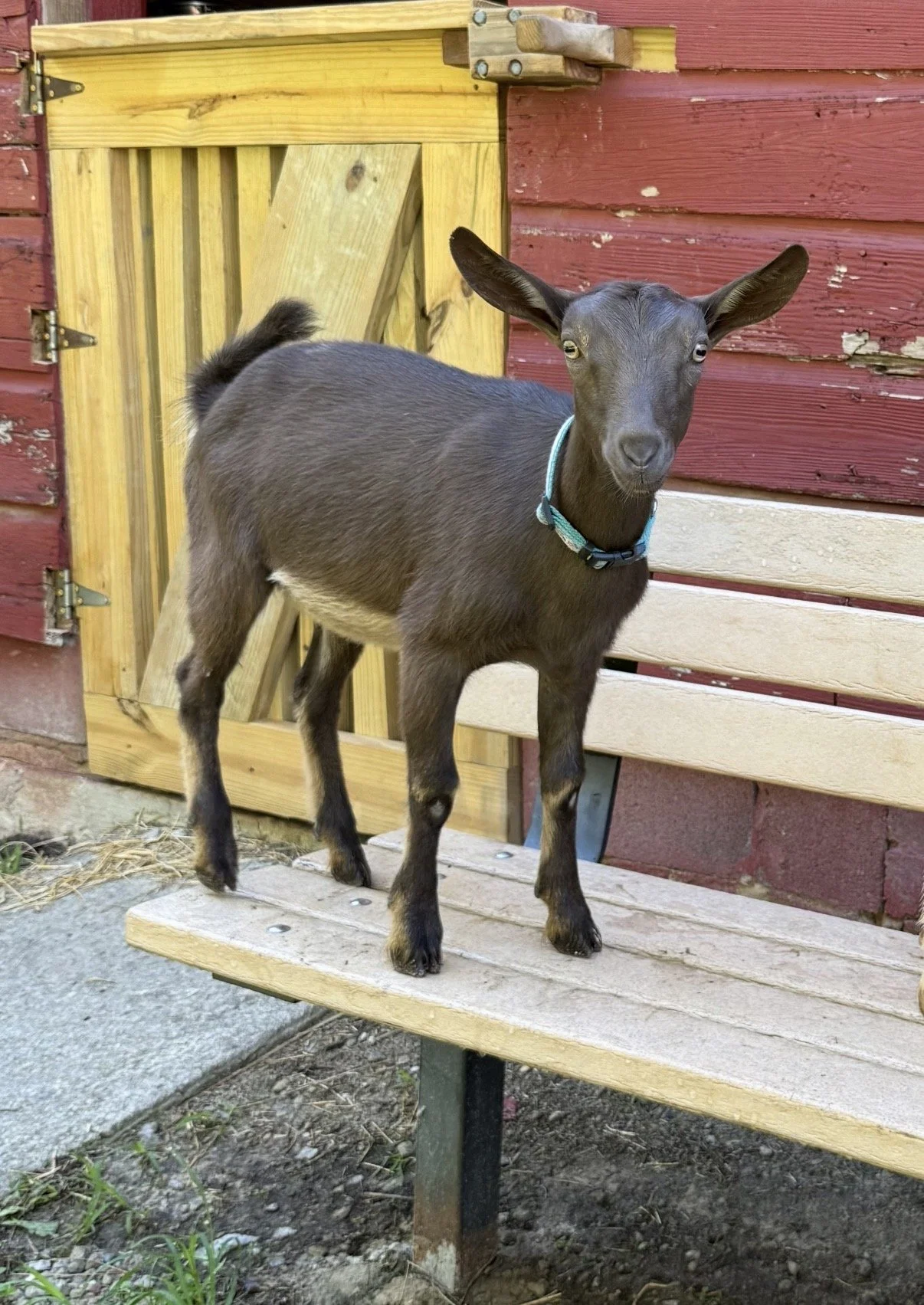 Godiva was one of only two kids born on the farm in 2025. She gave her mama Winona a challenge right from the start with being born breach! She is as decadent as her name suggests and loves to share her chocolatey sweetness with visitors.