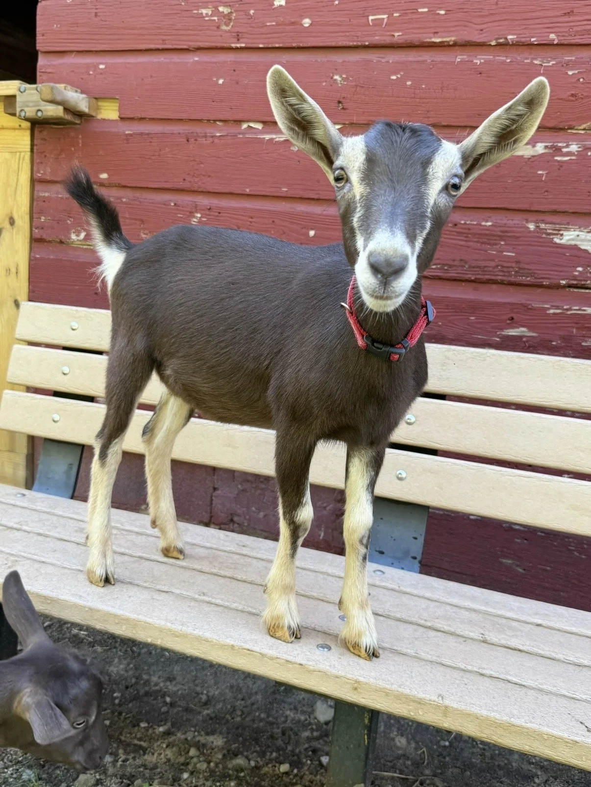 Jelly Bean was born on the farm on Easter weekend in 2024. She participated in all our goat yoga classes as a tiny baby so naturally she is quick to jump up to say hi to everyone. She’s always getting herself in trouble!