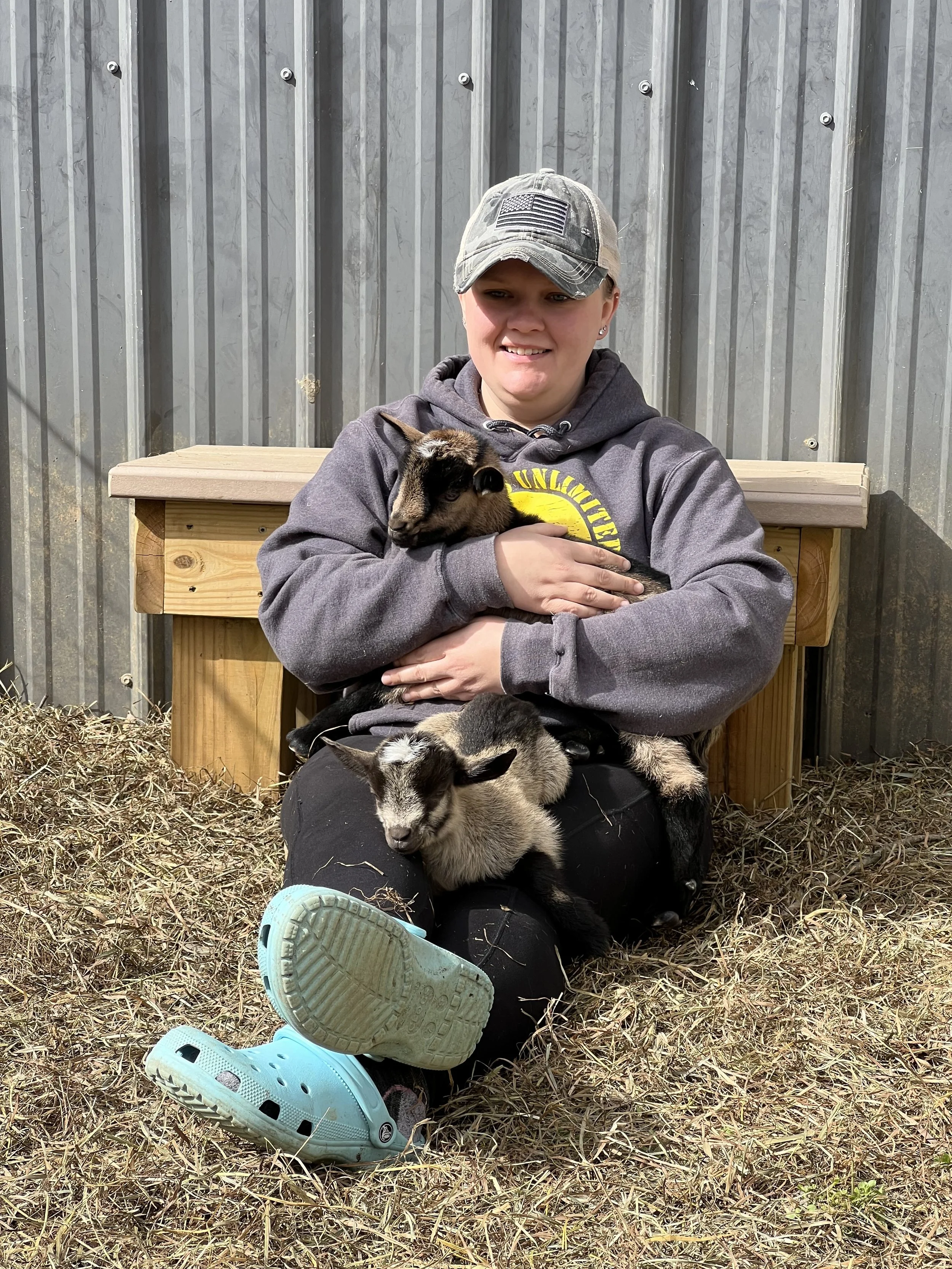 Khaleesi was born on the farm in 2024 and has been the sweetest little girl from the start. She is super sweet and loves to have visitors love on her!